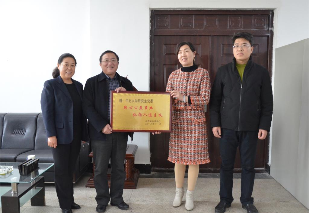 2018年11月29日,山西省血液中心主任白林、献血服务二科主任徐素霞一行专程向我院赠送“热心公益事业,弘扬人道主义”牌匾,以赞扬研究生院组织的公益献血活动,色花堂