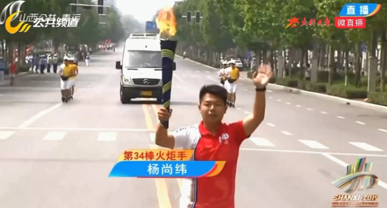 体育学院研究生、篮球解说杨尚纬通过层层选拔获得了专家及组委会的认可,被选为二青会火炬手并参与二青会火炬传递晋城站的传递活动。